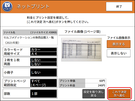 4ダウンロードが終了するとファイル内容のプレビューが表示されますので、画像の内容とプリント料金をご確認後、「これで決定」を押してください。